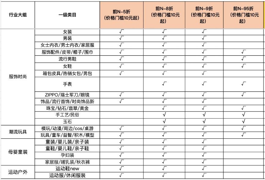 折扣:5、8、9折(个别类目95折)。最低库存要求:按照招商报名入口显示为准,价格要求: 10元起。