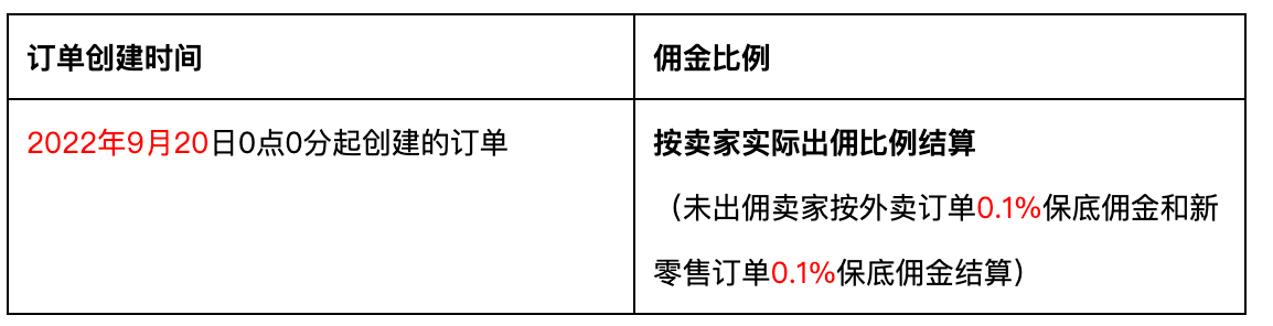 2022年9月20日00:00:00起创建的订单,按卖家实际出佣比例结算,未出佣卖家按外卖订单0.1%保底佣金和新零售订单0.1%保底佣金结算。