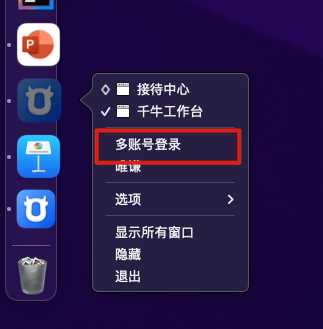 答:在Mac电脑的Dock栏,千牛图标上右键,点击“多账号登陆”