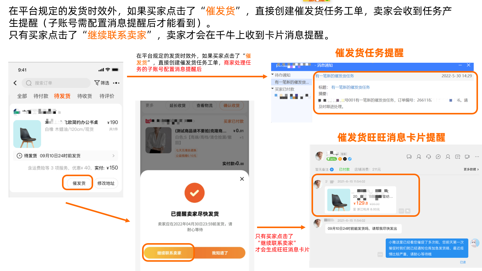 为了给买家打造更好的购物体验,平台为买家提供了“催发货”的能力,买家下单付款成功后,就可以在订单列表页等入口看到"催发货“按钮。买家点击”催发货“按钮会分为以下两种情况:
