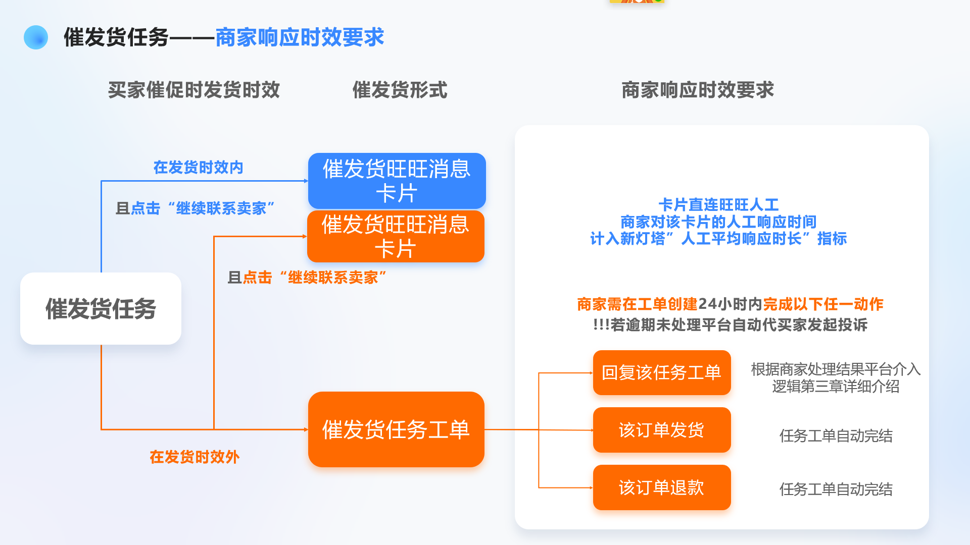 催发货任务工单创建以后,需要商家尽快联系买家沟通解决,商家可在24小时内完成发货、联系消费者完成退款或回复该催发货任务工单(3个动作中任一完成一个均可)进行任务处理。