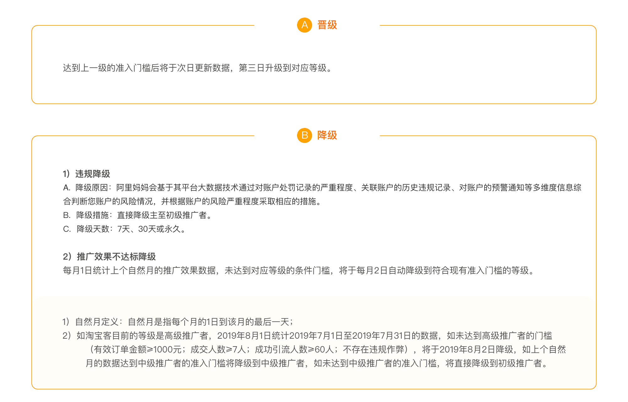 1、针对初级推广者和中级推广者,阿里妈妈会先向卖家收取费用,并以此为基数,按一定比率与推广者分成。分成比率由阿里妈妈基于推广者渠道类型、流量质量等众多因素综合独立确定且可调整。 2、高级推广者的结算按淘宝客佣金规则进行结算,维持不变。 1、初级推广者、中级推广者使用的是阿里妈妈服务,应遵守《阿里妈妈服务协议》。 2、推广者使用时应遵守《阿里妈妈推广者规范》及本规范的约定。 3、涉嫌违规后果:阿里妈妈会基于其独立认定的事实(违规行为性质、严重程度等),独立确定采取暂停结算全部或部分推广对应的收入。 4、正式处理措施:阿里妈妈会基于其独立认定的事实,独立确定采取不予结算全部或部分推广对应的收入。 5、阿里妈妈排查、涉嫌违规的判定标准及给推广者的通知、推广者申诉及违规的最终判定标准、返款卖家、证据保管均以《阿里妈妈推广者规范》规定为准。二、推广能力等级升降级规则