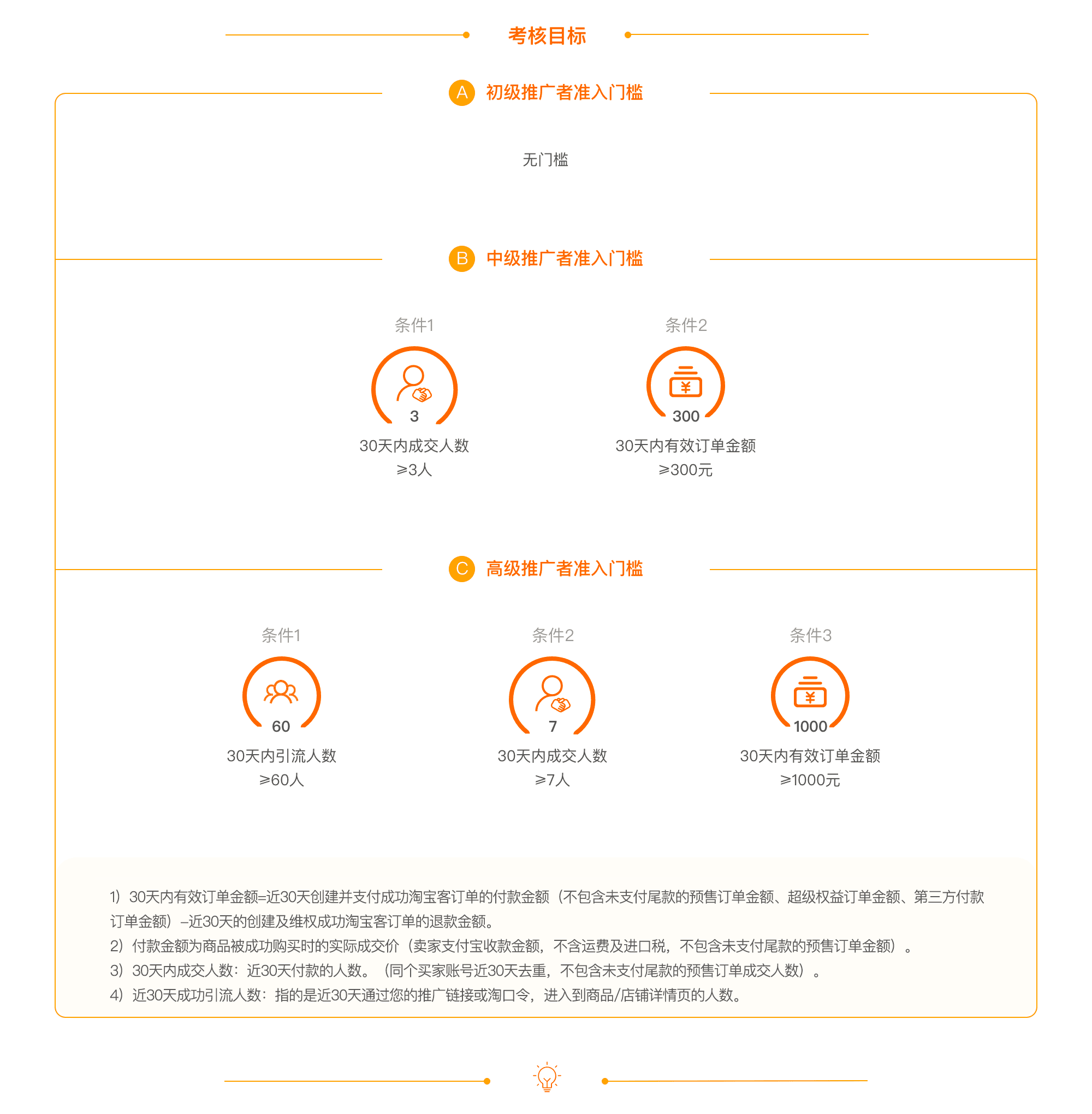 阿里妈妈推广者将分为初级推广者、中级推广者和高级推广者三个推广能力等级。各等级准入的基础要求为:阿里妈妈账户及其关联账户不得存在违规作弊情形。(解读:关联账户主要指淘宝账户、支付宝账户、收货人姓名、详细地址、联系方式、IP地址等用户身份相关的信息,其中任意一项或数项存在相同、相似、通过特定标记形成批量信息、或其他非真实有效等情形的,均将被认定为关联账户。) 以下等级都是针对符合淘宝客准入条件的账户。