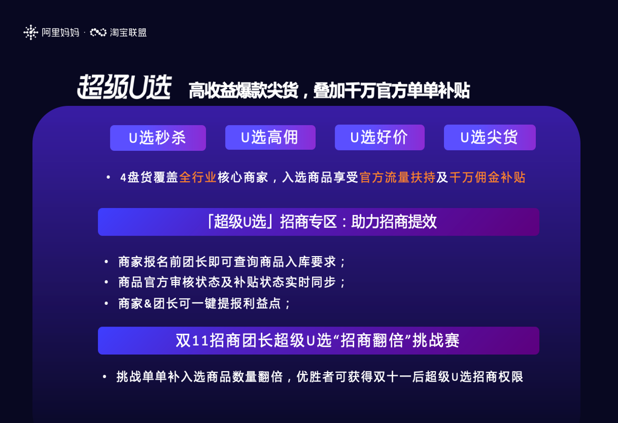 双11招商团长超级U选"招商翻倍挑战赛 挑战单单补入选商品数量翻倍,优胜者可获得双十一后超级u选招商权限