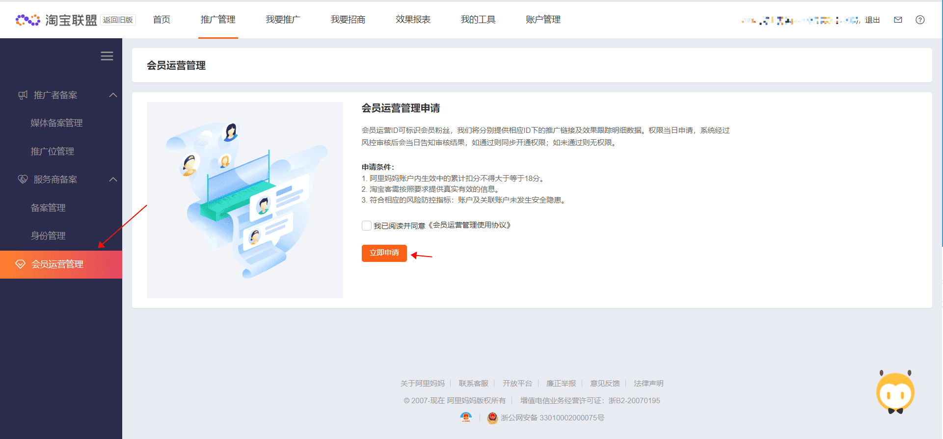 Step1:获取会员运营管理权限——登录pub后台一键申请获取权限