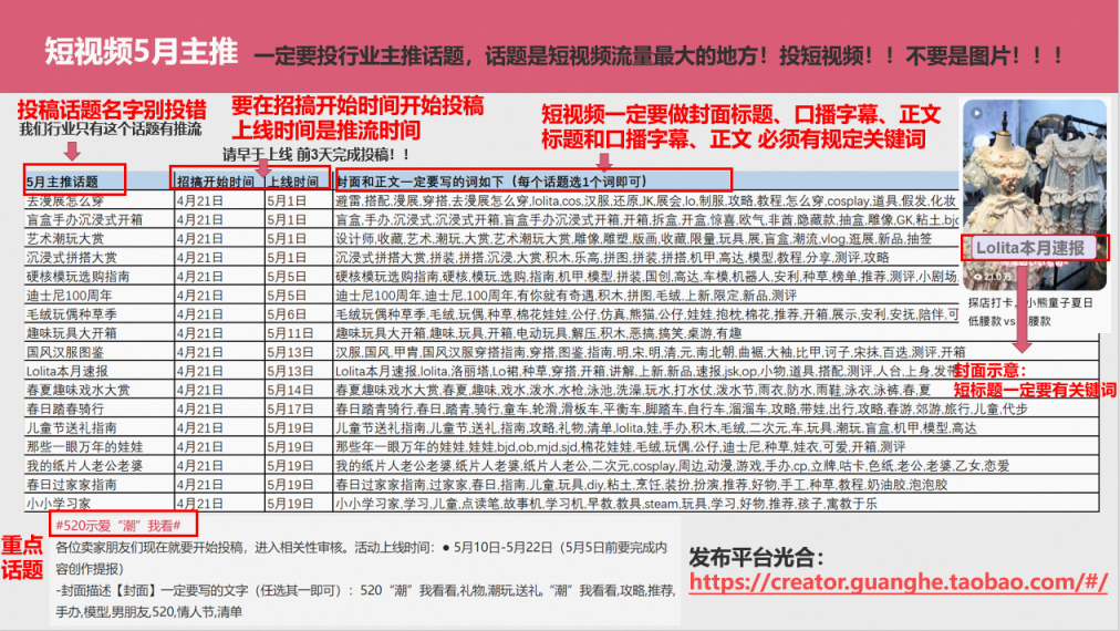 1)一定要投行业主推话题,话题是短视频流量最大的地方 2)一定要做封面图决定点击率,一定配字幕、前5s必须体现视频核心决定停留时长! 3)投稿必看!(以5月举例)