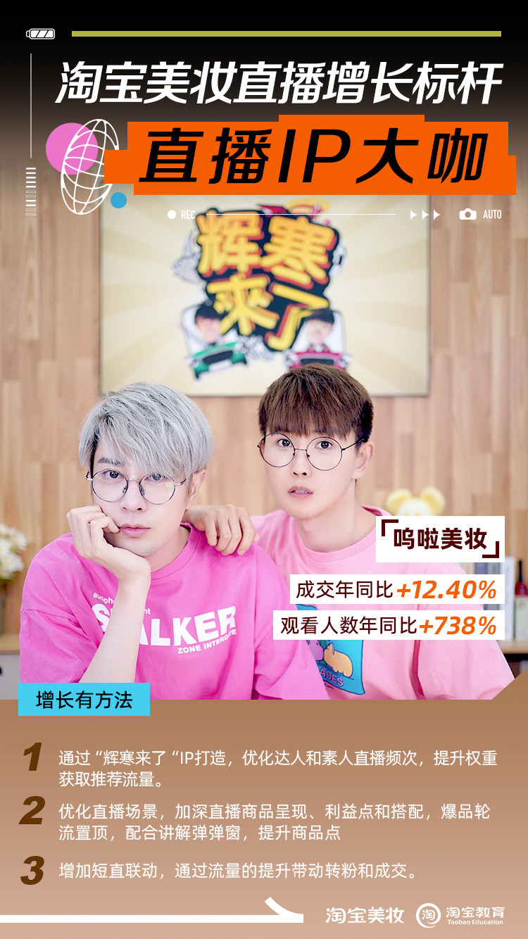2023年,在淘宝美妆行业和淘宝教育的陪跑支持下,呜啦美妆总结出一套适合红人店铺的独到打法,店铺年成交同比提升超12%,观看人数同比去年提升738%。