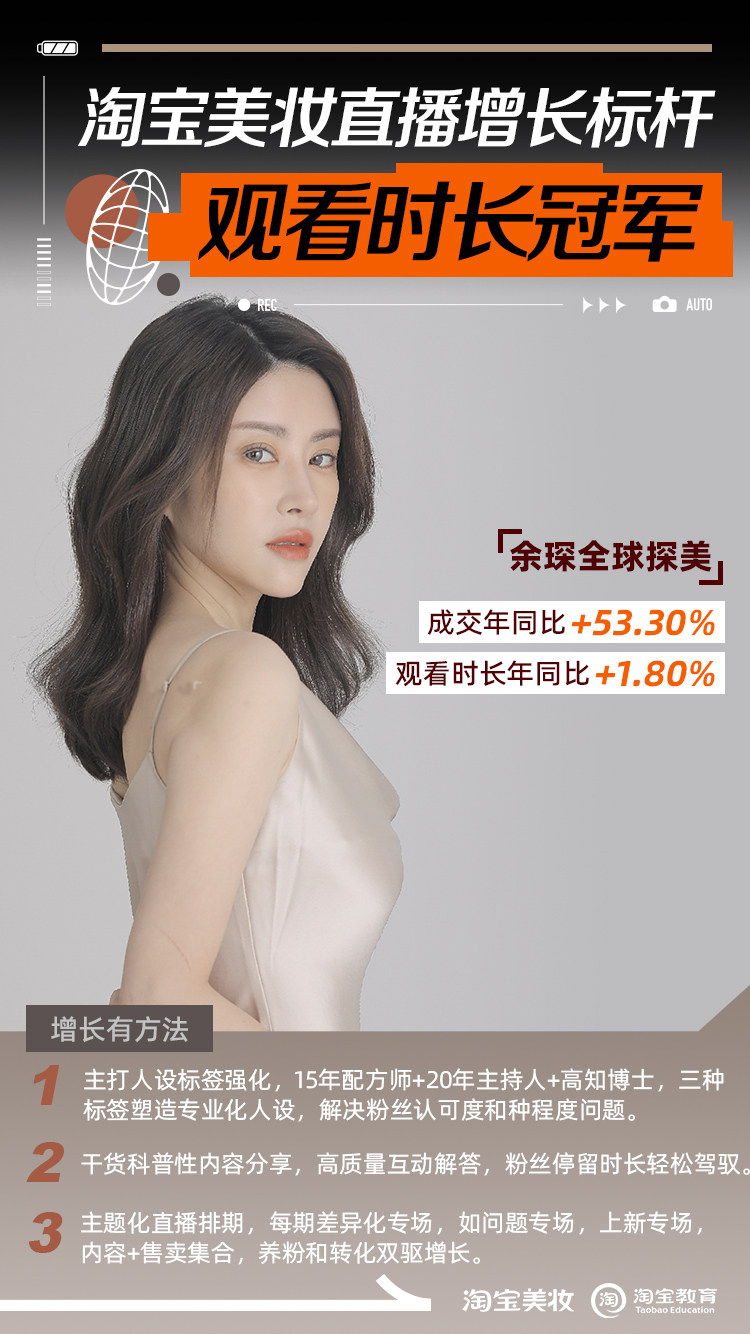 经过淘宝美妆行业和淘宝教育的直播陪跑,店铺年成交同比提升53.3&,观看时长同比提升1.8%。直播策略整理如下: