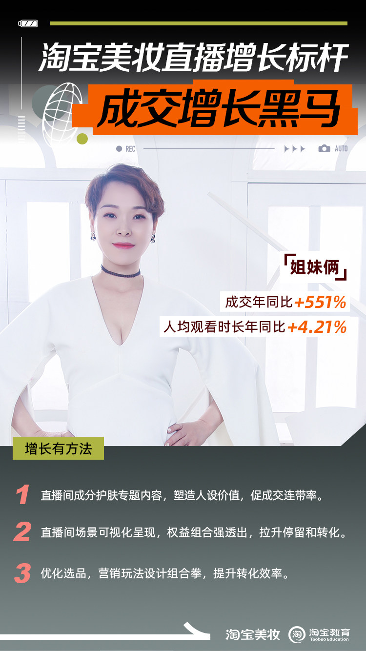 美妆知识普及一直是“姐妹俩美妆”的强项,在此基础上,淘宝美妆行业,协同淘宝教育在直播陪跑中对店铺人设、场景、选品持续优化,年成交同比提升551%,人均观看时长同比提升4.21%。 店铺增长方法如下:
