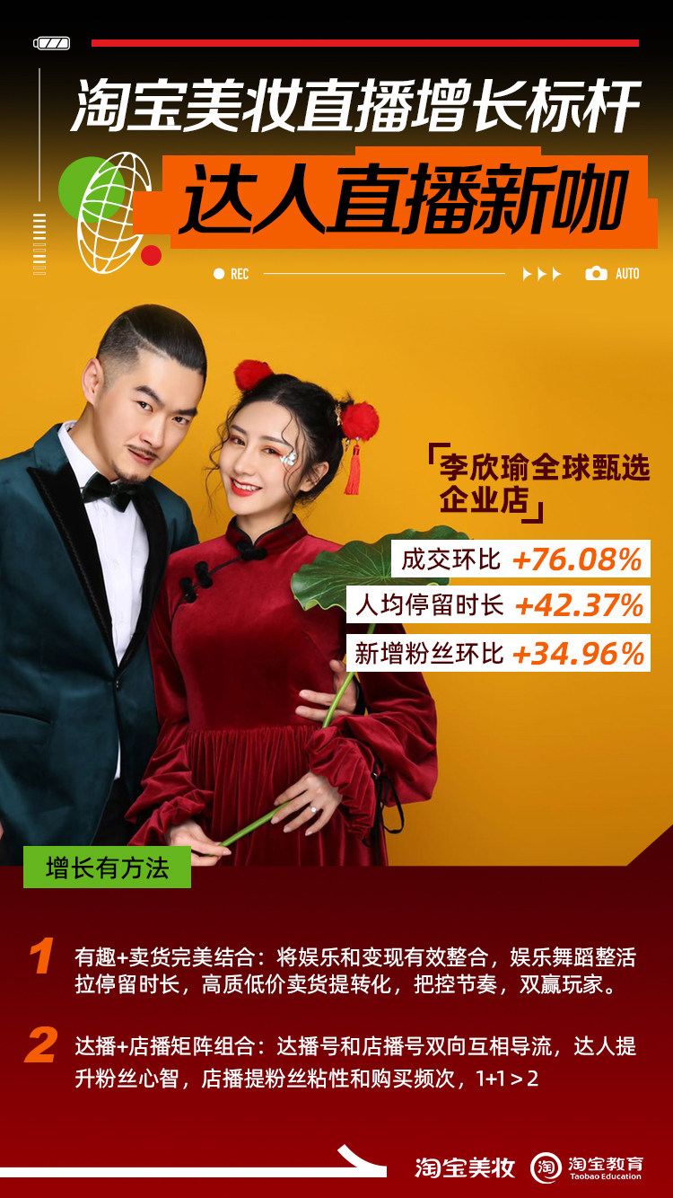 今年5月,新开直播型店铺“李欣瑜全球甄选企业店”。通过淘宝美妆行业以及淘宝教育的直播陪跑,在新店入驻短短一个月,成交环比上涨76%,人群停留时长提升超42%,新增粉丝环比上涨34.96%,是美妆类目达人直播店铺里增速最高的店铺之一。