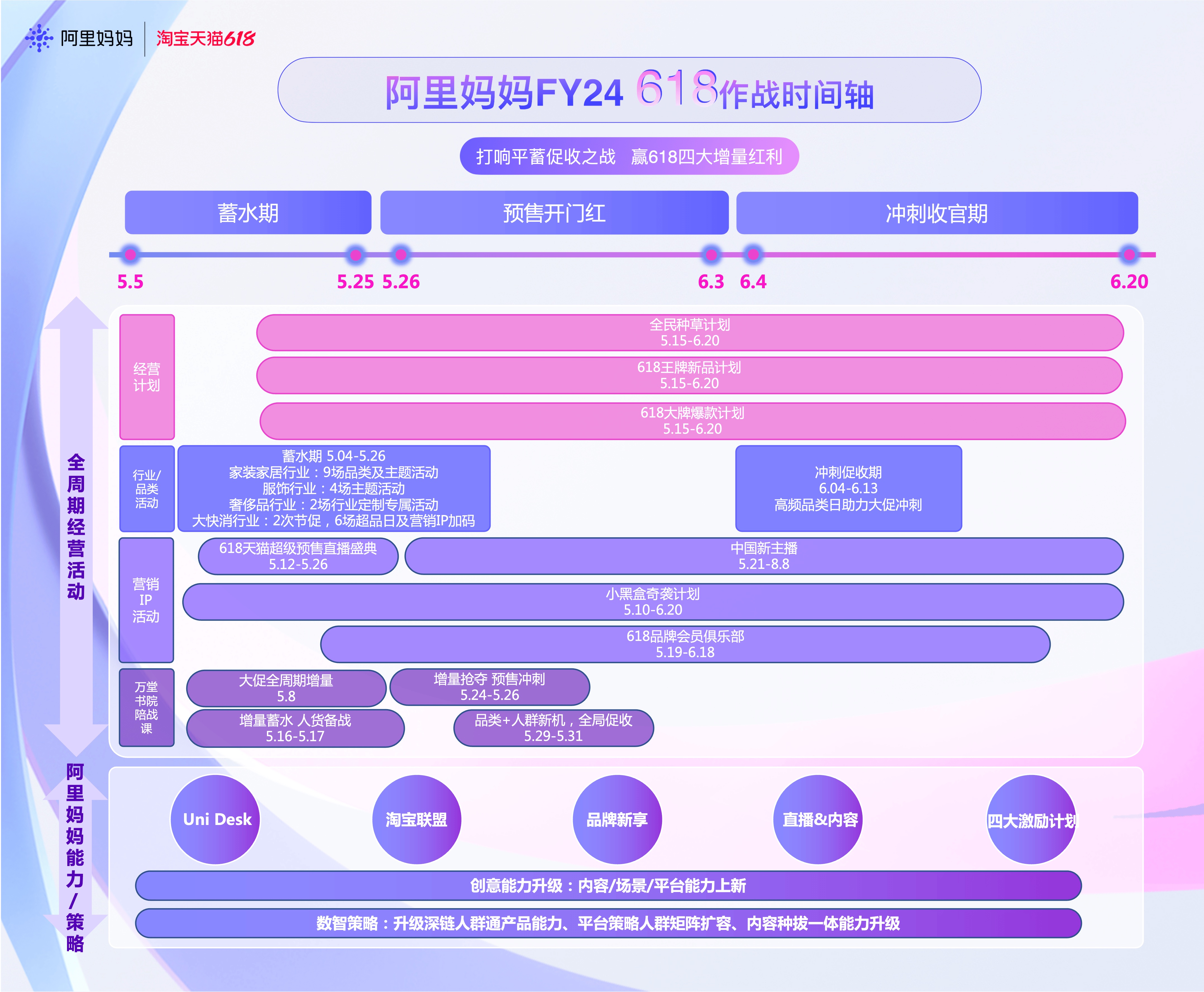为助攻品牌迎战618大促,阿里妈妈根据大促的不同阶段和目标,推出全周期经营活动。以三大经营计划、行业/品类活动、营销IP活动和万堂书院陪战课,覆盖「平·蓄·促·收」作战全周期(蓄水期:5.5-5.25、预售期&开门红:5.26-6.3、冲刺收官期:6.4-6.20),助攻品牌促收提效。