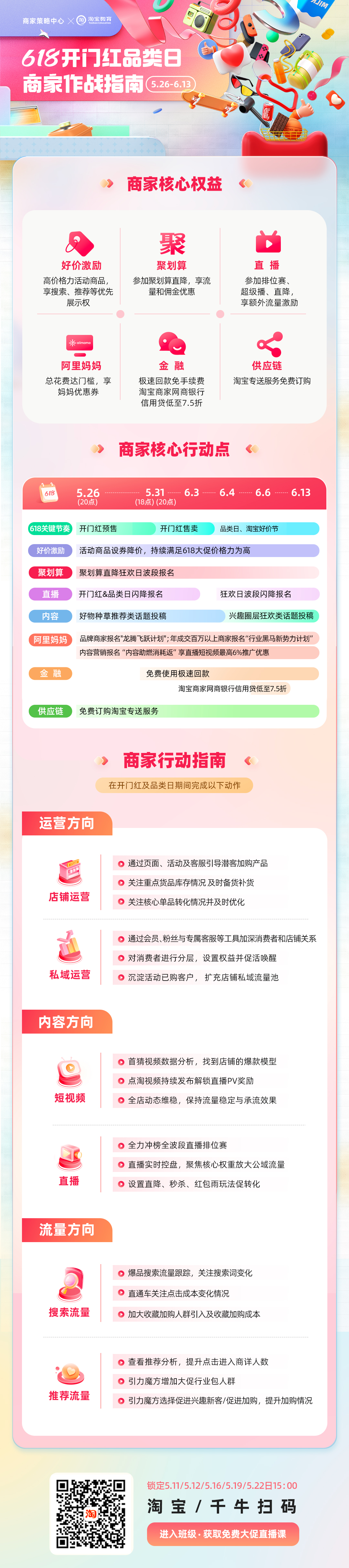 开门红及品类日期间作战指南已为商家朋友们准备好,按时间节奏帮大家整理了重点需要关注的行动点,并提供配套的培训课程指导,预祝商家朋友们618大卖!