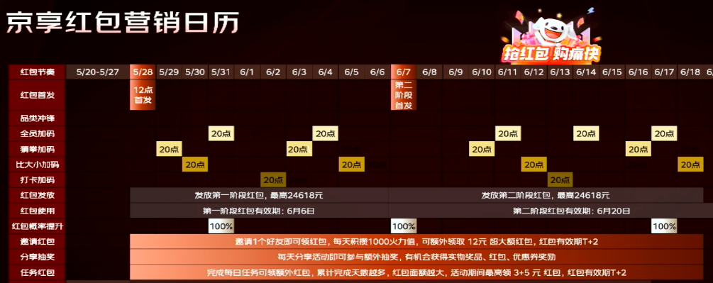 完成当日打卡任务,即算完成打卡,领取当日打卡红包。活动共计2个阶段(与红包发放阶段相同,每天都有打卡任务),每个阶段累计打卡天数越多,红包面额越大,活动期间最多领取3+5=8元京享红包。