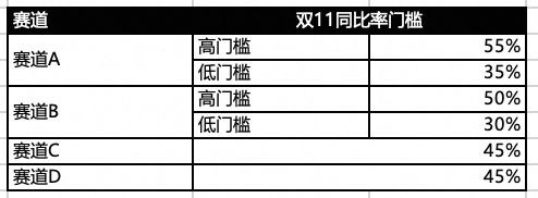 - 超红发放量完成率=周期内超红发放量/一阶段超红目标发放量=【2024年10月14日 19:00:00-10月16日23:59:59】的累计超红发放量/【2023年10月24日 20:00:00 -2023年11月3日 23:59:59】的累计超级红包发放量*(1+同比率门槛),A/B赛道同比率门槛为高门槛值。