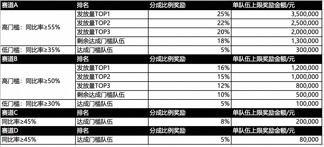 - -更高分成比例奖励:A/B赛道中,达成同比率门槛且累计超级红包发放量排名前N,队长和队员获得更高分成比例奖励,详见下述表格中的分成比例。淘宝客对表格中的各奖励比例仅可享受一档,不能叠加。