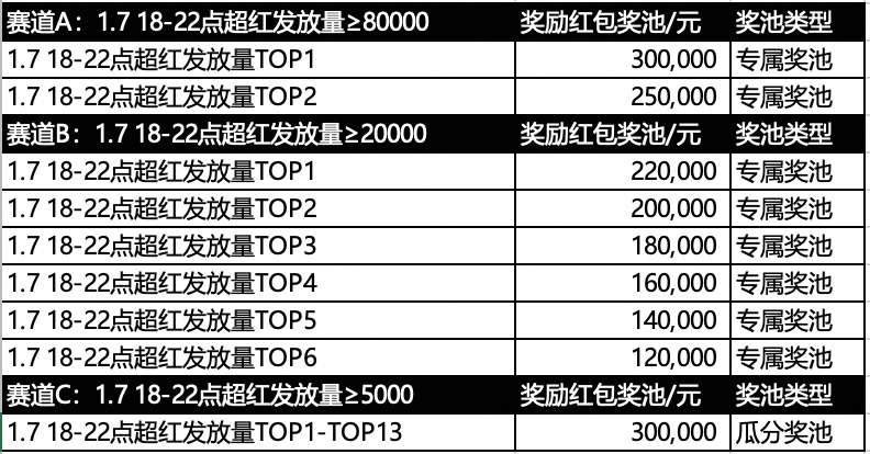 -奖励内容:按1月7日18:00:00-22:00:00的红包发放总量进行排名,达成各赛道红包发放总量门槛X的前提下,按发放量排名奖励规模不同的超级红包奖池,发放量越排靠前红包奖池规模越大。A/B赛道为专属奖池,排名前N的队伍按照各自排名获得相应奖池,CD赛道为瓜分奖池,排名前N的队伍共享一个奖池。各赛道的X/N值单独设置。