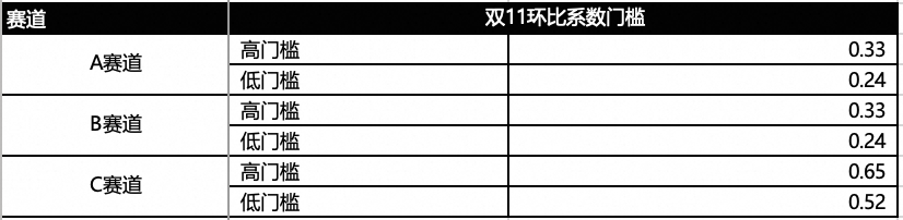 【奖励门槛】各赛道设置不同的双11超级红包(简称超红)发放量环比系数门槛。双11环比系数(以下简称环比系数)=(【2025年1月4日 10:00:00 -2025年1月16日 23:59:59 的累计超级红包发放数量】 /【2024年10月14日 19:00:00 -2024年10月24日 23:59:59】的累计超级红包发放数量)