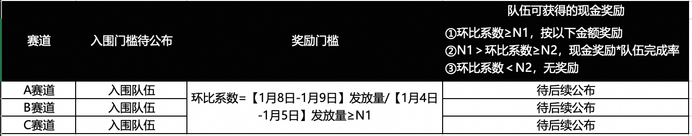 -若达成入围门槛,且红包发放量环比系数≥N,队伍可获得对应现金奖励,各队伍奖励金额单独设置。