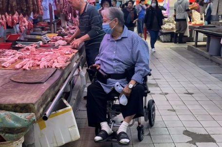 洪金宝独自坐轮椅买菜 认真挑选猪肉