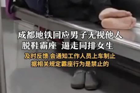 成都地铁回应男子无视他人脱鞋霸座英文可以简单翻译为:Chengdu subway responds to man ignoring others' shoes and sitting in front of them.。