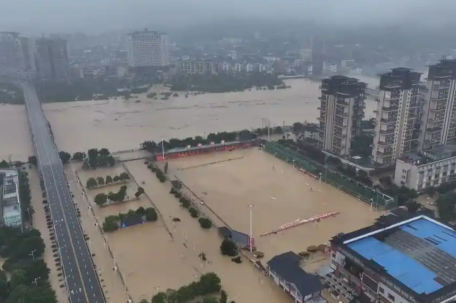 航拍:贵州榕江城区大面积被淹英文可以简单翻译为:Aerial Photography: The urban area of Rongjiang, Guizhou is extensively flooded.。