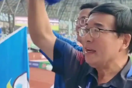 韩乔生来看苏超 高举宿迁队球衣英文可以简单翻译为:Han Qiaosheng came to watch Su Super, holding the jersey of Suqian team.。