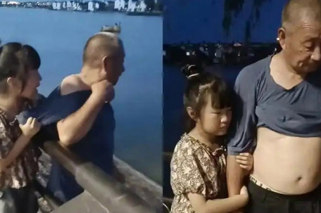 爷爷想下河捞玩具被孙女紧紧拉住英文可以简单翻译为:Grandpa wanted to go down to the river to find toys, but his granddaughter held him back tightly.。