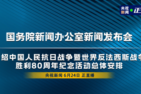 6月24日上午10时,国务院新闻办公室举行新闻发布会,介绍中国人民抗日战争暨世界反法西斯战争胜利80周年纪念活动总体安排。
