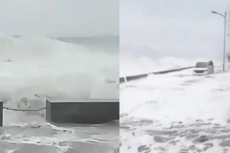 三亚海边狂风掀巨浪淹没公路英文可以简单翻译为:Sanya's beach is battered by fierce winds, creating huge waves that submerge the road.。
