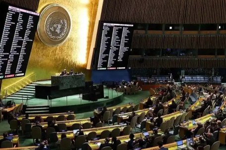联大通过决议要求以巴立即停火英文可以简单翻译为:The United Nations General Assembly passed a resolution calling for an immediate ceasefire between Israel and Palestine.。
